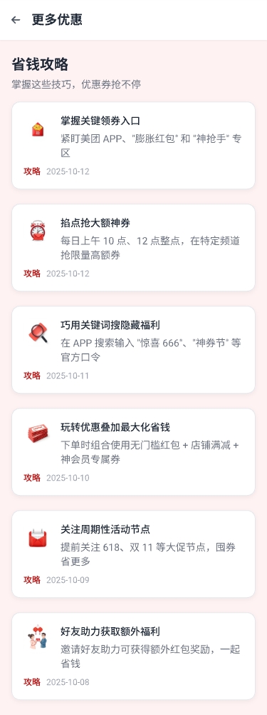 京美订餐神券通过智能算法实时匹配您所在地区的外卖商家优惠信息,覆盖美团、饿了么等主流平台,点击即可一键领取大额满减券、折扣券、免配送费券,让每一单都省到极致!